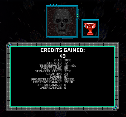 I really enjoyed playing this game. It is a lot of fun to find different builds that could possibly work. But although it is so fun I personally don’t like the fact that the weapons you get are fixed until you have the third, making it much less interesting since you’ll always have the same certain weapons (especially with the low amount of threat levels in this demo). A feature I think would also be quite helpful for players is a menu during the game where you can see all of you scrap upgrades and weapons, allowing some theorycrafting. And last I was wondering how percentage on the x2/x3 chance card works, because even when im over 100% of this card I still wont be able to get a lot of multiplied upgrades.